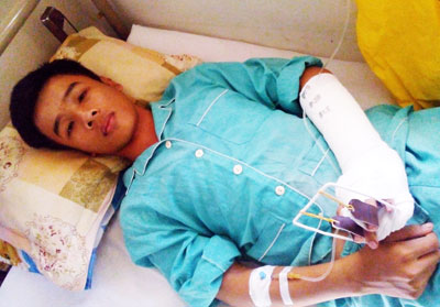 Chiều 16/11, sau khi trải qua ca phẫu thuật nối lại gân bàn tay trái, khâu lại các vết thương khác trên người, em Phạm Bá Hiếu (SN 1997, đang điều trị tại Khoa hồi sức cấp cứu, Bệnh viện Đa khoa tỉnh Khánh Hòa) đã tỉnh táo phần nào và có thể trò chuyện với phóng viên.