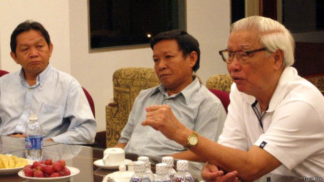 Ông Võ Như Lanh (giữa) trong cuộc trò chuyện với cố Thủ tướng Võ Văn Kiệt và nguyên TBT Tuổi Trẻ Lê Văn Nuôi
