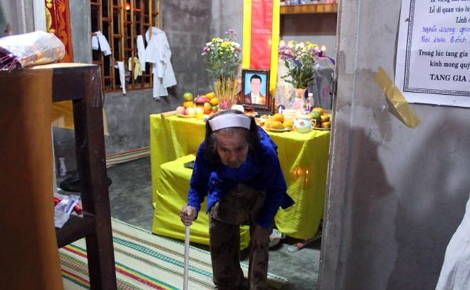 Giữa những tiếng khóc xé lòng đó, cảnh người mẹ già của anh (cụ Lương Thị Mễ, 85 tuổi) với vành tang trắng trên đầu, khuôn mặt thất thần như hóa đá trong nỗi đau quá lớn khiến nhiều người không thể cầm lòng.