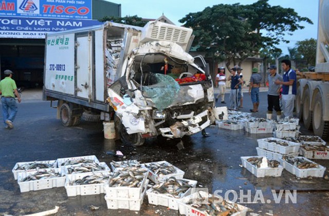 Vụ va chạm đã khiến cabin xe tải bị bẹp dúm lại, dồn về phía trước, toàn bộ phần đầu xe vỡ nát, bẹp dúm. Cá trên thùng xe tải văng tung tóe khắp đường, nhưng được người dân gom lại cho chủ xe sau đó.