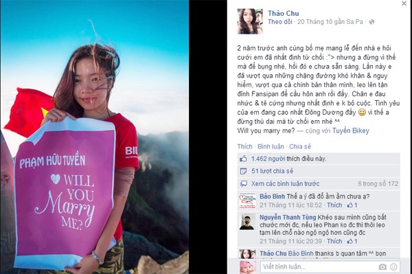 Cô gái này là Chu Thị Thảo, sinh năm 1991, đến từ Hà Nội. Cô và cậu người yêu tên Hữu Tuyền đã yêu nhau 5 năm. Cách đây 2 năm, Tuyền từng cầu hôn Thảo nhưng cô từ chối vì lúc đó còn nhiều dự định và chưa sẵn sàng bước vào cuộc sống hôn nhân. Đến bây giờ khi đã sẵn sàng cô nàng đam mê Phượt này đã tỏ tình độc thế này đây, cô đã chia sẻ trên fb của mình hình chụp lời cầu hôn kèm theo caption: