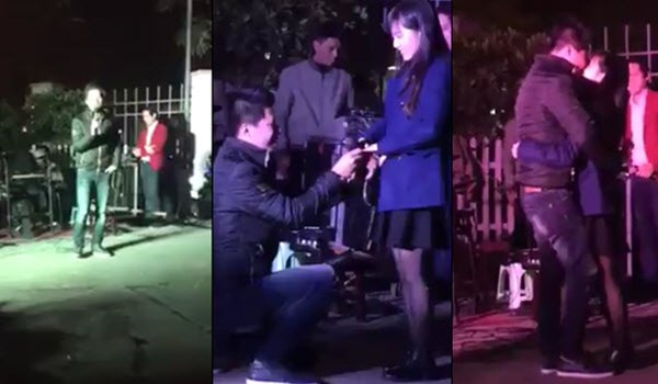 Tiếp đó, chàng trai này mời bạn gái của mình lên giữa sân, ngồi xuống và hỏi cô: “Em có đồng ý làm vợ của anh không?”.