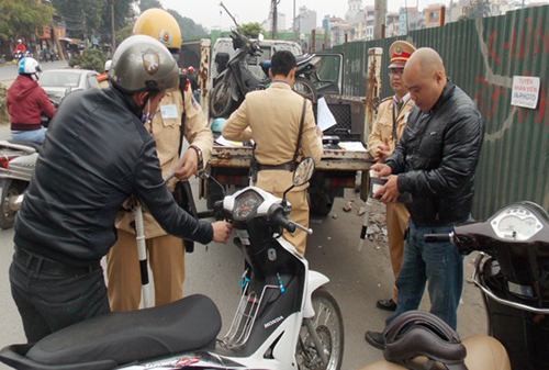 | Sau khi được CSGT đo nồng độ cồn, người tham gia giao thông này đã vi phạm và bị giữ phương tiện. Ảnh chụp tại nút dốc Bưởi (Hà Nội) trưa 24/12. Ảnh: Trọng Đảng |