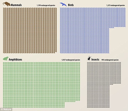 Nghiên cứu được tiến hành bởi tạp chí khoa học Nature cũng cho thấy hơn 1/4 tổng số động vật có vú và 13% loài chim đứng trước nguy cơ tuyệt chủng do những hành động của con người. Cuộc đại tuyệt chủng thứ 6 có thể trở thành hiện thực vào năm 2200, nếu các loài tiếp tục biến mất với tốc độ hiện nay.