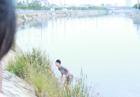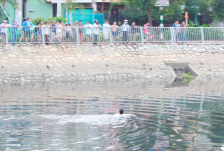 Nguyễn Hùng Tú đang "thi gan" với cảnh sát khi bơi dọc kênh Tàu Hủ