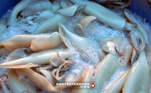 Mực được ngâm ôxy già rồi đóng thùng vận chuyển đi các tỉnh tiêu thụ.