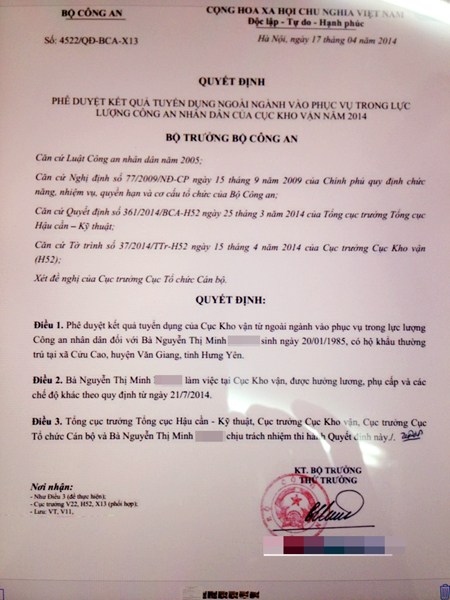 Tiếp đó, Hùng còn đặt làm giả một quyết định tuyển dụng chị N. vào công tác tại một đơn vị hậu cần tháng 7/2014. Thấy nhanh chóng có quyết định tuyển dụng, chị N. vô cùng phấn khởi và tin tưởng người yêu.