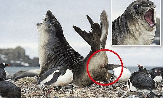 Mới đây, một nhiếp ảnh gia đã ghi lại những hình ảnh thú vị tại Nam Cực, trong đó có cảnh một chú hải cẩu xâm chiếm khu vực của loài chim cánh cụt. Để phản đối sự xâm chiếm này, một chú chim cánh cụt đã dũng cảm chiến đấu với đối thủ to hơn mình rất nhiều lần và không ngần ngại cắn trúng "bàn tọa" của hải cẩu. Chú hải cẩu không khỏi hốt hoảng vì đau đớn với biểu cảm vô cùng ấn tượng. Khoảnh khắc vừa khổ sở vừa hài hước này đã được nhiếp ảnh gia ghi lại hết sức sống động.