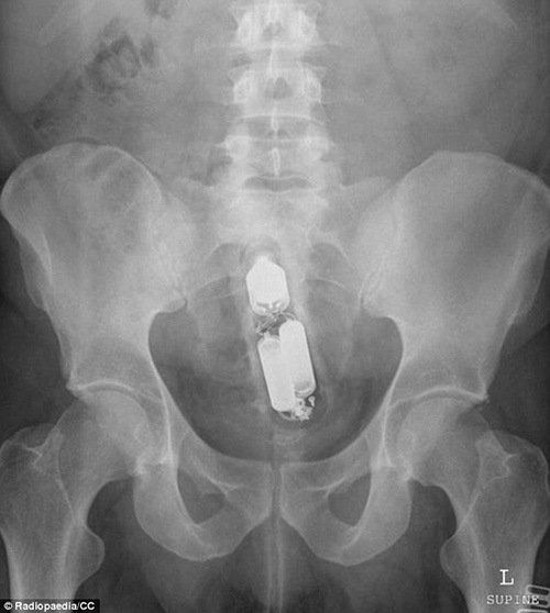 VBF- Đây là các hình ảnh được cung câp bởi các bã sĩ trong bệnh viện. Các bênh nhân sau khi để lọt các đồ vật vào người đã phải đi cấp cứu tại bệnh viện và đã được chụp X-quang để xác định đồ vật đó.Đó thường là những "vật dụng bất bình thường" được các bác sĩ khắp thế giới tìm thấy bên trong trực tràng của các bệnh nhân và chia sẻ trên trang Radiopaedia, một website giáo dục và thảo luận do các sinh viên X-quang thành lập từ năm 2005. Hình ảnh X-quang được chia sẻ trên website là vật mẫu cho việc nghiên cứu hợp tác và là giáo cụ trực quan trong giảng dạy ngành học quang quyến (môn học X-quang), hoặc dùng làm tài liệu cho các bảo tàng, đồng thời là những ví dụ giúp mọi người cảnh giác. hiếc chày trong trực tràng người đàn ông 40 tuổi được "khổ chủ" giải thích khi nấu món ăn Malaysia đã bị trượt vào trong??? Một chai đựng cà phê với những chiếc ghim gắm vào lớp cao su phía dưới nắp được bệnh nhân đưa vào trong cơ thể. Một tuýp đựng vitamin được đưa vào trong trực tràng. Thậm chí một chiếc chai cũng nằm trong danh sách bộ sưu tập các bác sĩ X-quang thu thập được. Dụng cụ rung được đưa vào qua đường hậu môn. tm tm