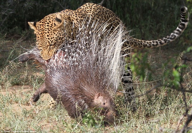 Cuộc chiến kết thúc sau khi con báo bị lông nhím cắm vào chân và miệng. (Nguồn: Daily Mail)