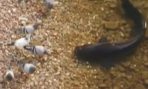 Một cảnh tượng hiếm gặp đã xảy ra làm ngỡ ngàng nhiều người chứng kiến: những con cá trê khổng lồ liều lĩnh lao lên bờ bắt chim bồ câu. Đúng là khi đói thì chuyện gì cần làm cũng phải làm hết!