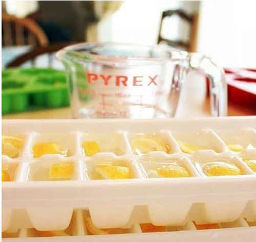 Cho dấm và các lát chanh nhỏ vào khay đá, bỏ lên ngăn đá tủ lạnh. Mỗi khi muốn lau rửa, bạn chỉ cần lấy ra mấy viên cọ rửa là xong.
