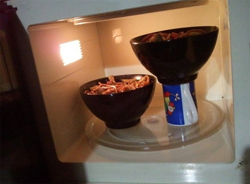 Khi muốn quay cả 2 bát to đùng trong lò vi sóng, bạn có thể dùng một cái cốc rồi đặt một bát lên trên. Nhớ là bát phải nặng vừa thôi, không là đổ hết cả ra máy đấy.