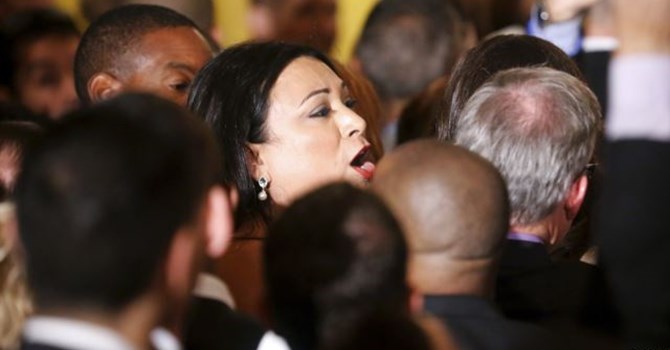Người ta có thể nghe thấy bà này hét lên cả bằng tiếng Anh và tiếng Tây Ban Nha trong buổi tiếp tân tại Nhà Trắng với sự tham gia của khoảng 200 người.