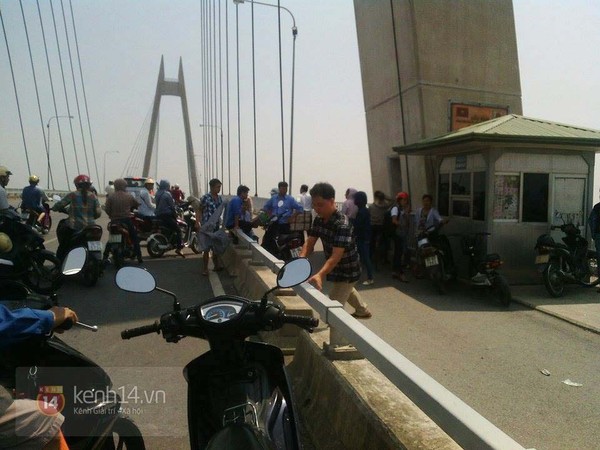 Hàng chục người dân đứng trên cầu Bính theo dõi sự việc.