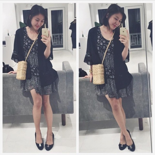 Văn Mai Hương diện chiếc làn đeo chéo với váy hè và giày cao gót.