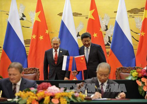 Lãnh đạo Trung Quốc, Nga chứng kiến lễ ký các thỏa thuận hợp tác song phương hôm 3/9. (Ảnh: AFP/TTXVN)