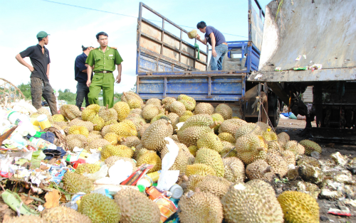 Sầu riêng đang được tiêu hủy. Ảnh: Kh.Uyên