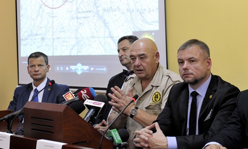 Ông Krzysztof Szpakowski (giữa) phát biểu trong cuộc họp báo ở thị trấn Walbrzych. Ảnh: AFP