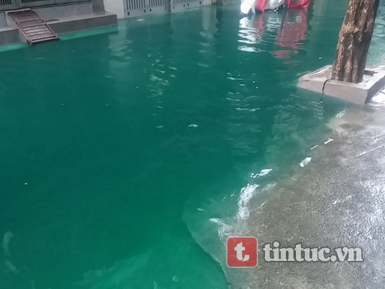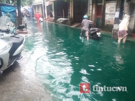 Sau hàng loạt các trận mưa to kéo dài tại Hà Nội, một dòng nước có màu xanh kỳ lạ đã xuất hiện tại ngõ 87 Tam Trinh, một trong những nơi bị ngập nặng nề.