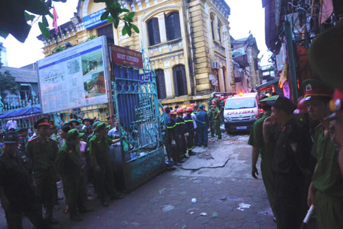 Con ngõ nhỏ sát tòa nhà bị sập là nơi buôn bán rau quả và đồ ăn của hàng chục người. Phần mái và một phần bức tường cao vài mét của ngôi nhà cổ đổ xuống ngõ đúng vào buổi trưa, vắng cả người bán lẫn người mua nên thiệt hại giảm đáng kể.