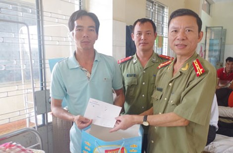 Đại diện lãnh đạo Công an tỉnh Đắk Nông đến thăm hỏi, tặng quà động viên ông Luận tại bệnh viện.