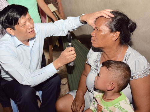 Thứ trưởng Bộ Y tế Nguyễn Thanh Long khám mắt cho một phụ nữ bị mù tại thị xã Vĩnh Châu, Sóc Trăng. Ảnh: H.N.