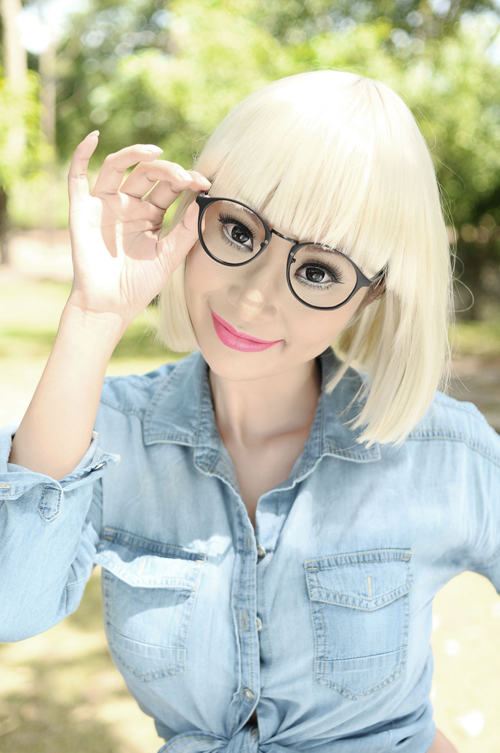 Lê Kiều Như đội tóc giả, nhí nhảnh tạo dáng như thiếu nữ tuổi teen trước ống kính.
