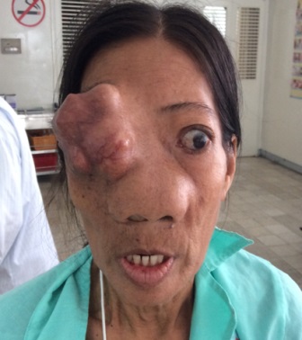 Chiều 2/11, các bác sĩ tại bệnh viện Chợ Rẫy đã không khỏi ngỡ ngàng khi ca bệnh đã được phẫu thuật thành công trước đó, quay lại bệnh viện với một khối thịt lớn như quả dừa mọc ra từ hốc mắt. Khối thịt có biểu hiện bị hoại tử, bốc mùi hôi thối.