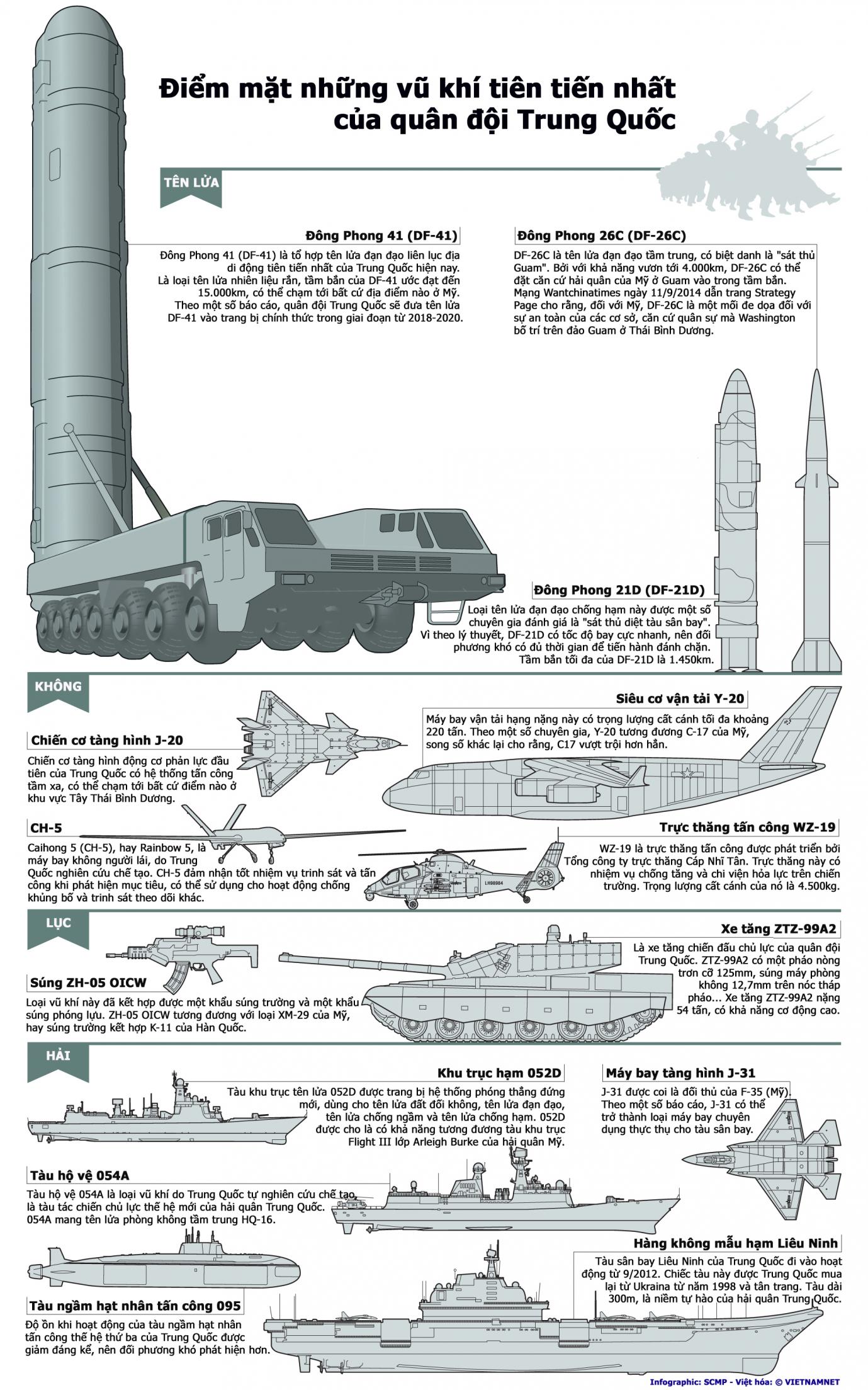 Infographic dưới đây sẽ cho thấy uy lực của một vài loại vũ khí tiên tiến nhất do chính Trung Quốc nghiên cứu chế tạo, như tên lửa đạn đạo liên lục địa Đông Phong 41, “sát thủ diệt tàu sân bay” Đông Phong 21D, xe tăng chiến đấu chủ lực ZTZ-99A2, tàu hộ vệ 054A, tàu ngầm hạt nhân tấn công 095, máy bay không người lái CH-5...