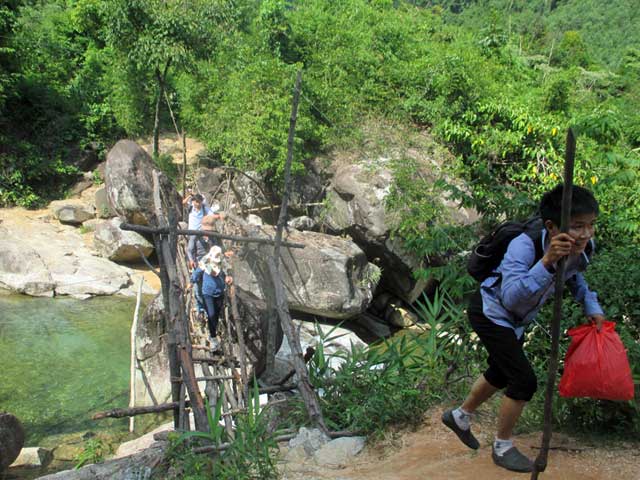 Suốt nhiều năm qua, để vượt con suối rộng gần 40m nằm trên con đường độc đạo vào làng, gần 100 người ở thôn 2, xã Trà Giang, huyện miền núi Trà Bồng, tỉnh Quảng Ngãi phải đi qua chiếc cầu treo tạm bợ làm từ cây, dây rừng.