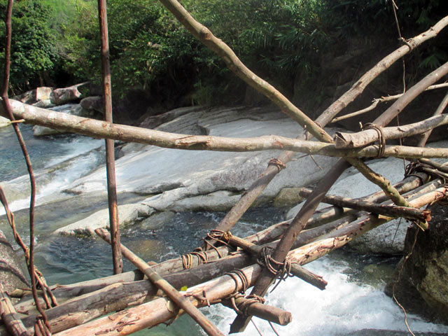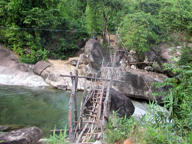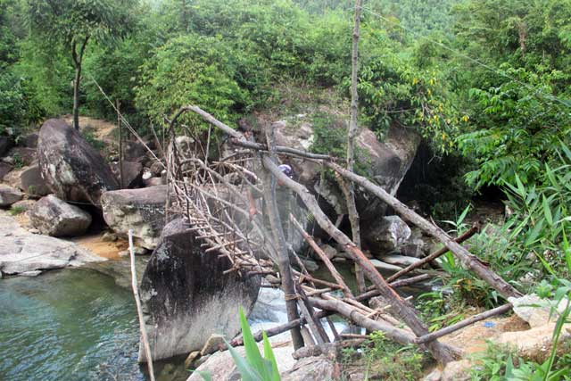 Để làm được cây cầu này, người dân chọn vị trí hẹp nhất của con suối, với chiều dài khoảng 15m và tận dụng những hòn đá khá lớn nằm ở giữa làm trụ; chặt cây làm sàn, rồi dùng dây rừng để cột giữ và vịn để qua lại.