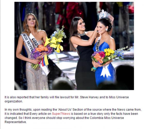 Rõ ràng chuyện Hoa hậu Colombia tự sát sau khi bị công bố nhầm Hoa hậu là không có thật, nó hoàn toàn là một câu chuyện giả tưởng của trang Super7News để thu hút độc giả khắp thế giới.