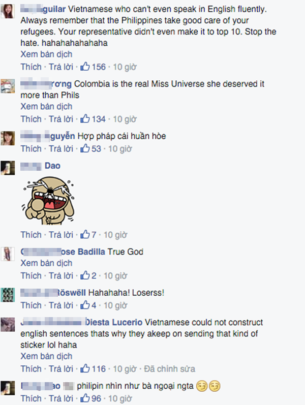 "Tôi có thể hiểu được nếu người Colombia ghét kết quả cuộc thi này. Nhưng tôi rất thất vọng với những người Việt Nam không thể chấp nhận thực tế là họ đã không giành được bất cứ điều gì từ cuộc thi Hoa hậu", Anj Aguilar - người Philippines bình luận.