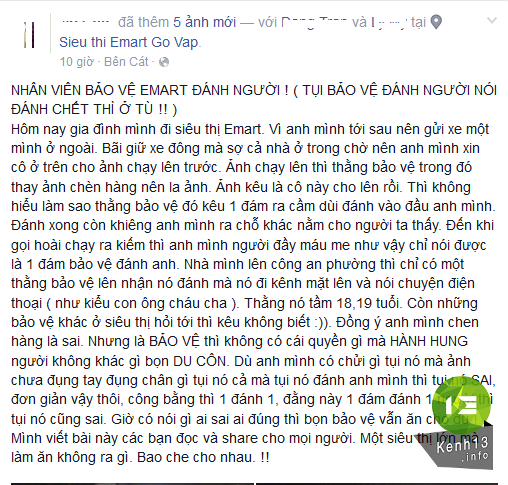 Sự việc xảy ra vào tối hôm qua (8/1) tại siêu thị Emart (Q. Gò Vấp – TPHCM) trước sự chứng kiến của nhiều người mua hàng có mặt tại siêu thị. Nạn nhân là người đàn ông tầm 30 tuổi, bị nhân viên siêu thị đánh đến chảy máu đầu, hiện đang bị chấn thương rất nặng. Người nhà của nạn nhân đã nhanh chóng chia sẻ câu chuyện và hình ảnh lên trang cá nhân.