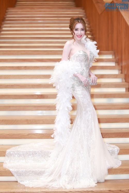 Cô diện một bộ váy đuôi cá lộng lẫy do nhà thiết kế Phạm Đặng Anh Thư thực hiện riêng. Gam màu trắng tinh khôi, đặc biệt kết hợp xu hướng choàng lông vũ là điểm nhấn giúp nhan sắc của Elly Trần thêm phần xinh đẹp, rực rỡ.Ngoài trang phục, Elly Trần cũng chăm chút trang điểm khi kẻ viền dày ở đuôi mắt và lớp phần nền nhẹ nhàng. Son môi màu hồng đậm trở thành điểm nhấn trên gương mặt.