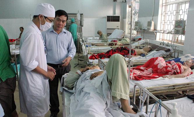 Ông Đức (đứng bên trái) giám đốc sở Y tế đến thăm hỏi động viên tinh thần hành khách bị thương và đôn đốc y bác sĩ tích cực cứu chữa cho hành khách - Ảnh M.T.