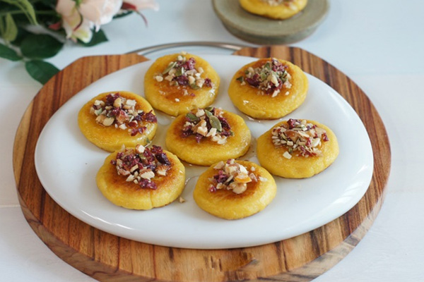 Xếp bánh lên đĩa, bằm nhỏ các loại hạt. Bạn rưới mật ong lên mặt bánh và rắc các hạt đã thái nhỏ lên trên là xong.