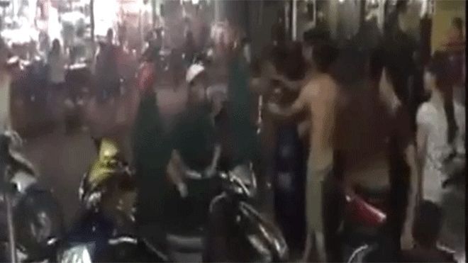 Có nhiều tiếng la hét của người dân xung quanh. Một giọng nam nói "Buông người ta ra" trong lúc người đàn ông cởi trần giơ tay tỏ ý can ngăn.