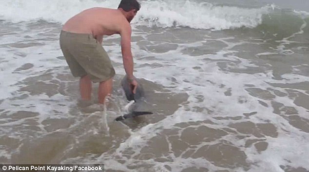 Anh Naude nhanh chóng bế chú cá heo trở lại biển.