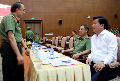 Trung tướng Lê Đông Phong trò chuyện với Bí thư Thành ủy Đinh La Thăng trong hội nghị.