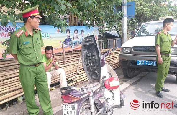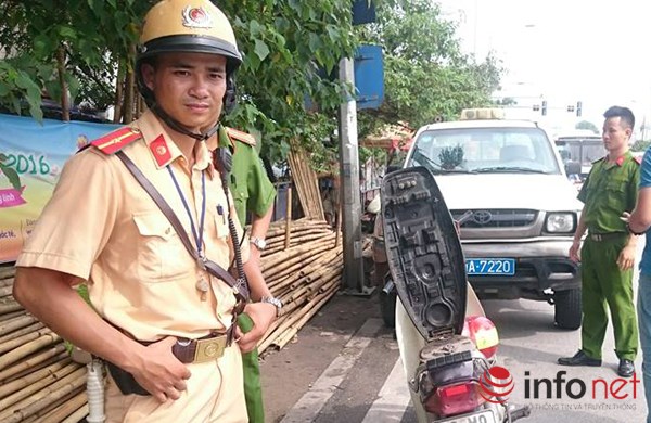 Trước đó, vào khoảng 13h40’ ngày 29/6, tổ tuần tra Đội CSGT số 4 đang làm nhiệm vụ trên đê Nguyễn Khoái, phường Bạch Đằng, quận Hai Bà Trưng, Hà Nội phát hiện thanh niên điều khiển xe máy mang BKS: 29-M8 - 4500 không đội mũ bảo hiểm đã ra tín hiệu dừng xe kiểm tra.