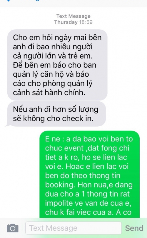 Sau khi nhận được dòng tin nhắn này, người thuê phòng đã cảm thấy vô cùng bức xúc.Anh S. đã chia sẻ trên tờ Trí thức trẻ rằng: “Công ty chúng tôi đặt 3 phòng tại Mường Thanh Apartment khi đi nghỉ mát tại Nha Trang vào ngày 25/06/2016 qua website trung gian với số lượng 14 người lớn và đã đóng tiền ngay qua thẻ tín dụng. Đêm 24/6, trước ngày khởi hành, người cho thuê phòng có gọi điện thoại yêu cầu tôi cung cấp thông tin về số lượng thành viên trong đoàn.
