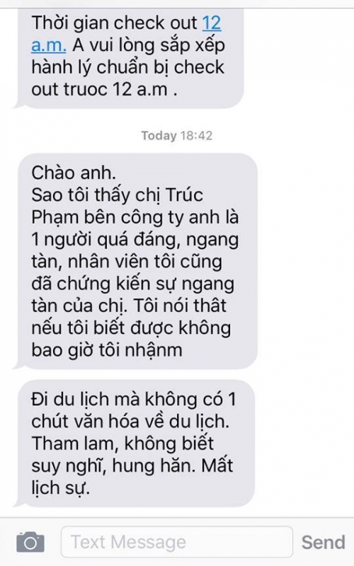 Còn người cho thuê phòng cũng đã nhắn cho một nhân viên của anh S. với dòng tin nhắn: “Chào anh. Sao tôi thấy chị T.P bên công ty anh là một người quá đáng, ngang tàn, nhân viên tôi cũng đã chứng kiến sự ngang tàn của chị. Tôi nói thật nếu tôi biết được không bao giờ tôi nhận. Đi du lịch mà không có một chút văn hóa về du lịch. Tham lam, không biết suy nghĩ, hung hăng. Mất lịch sự".
