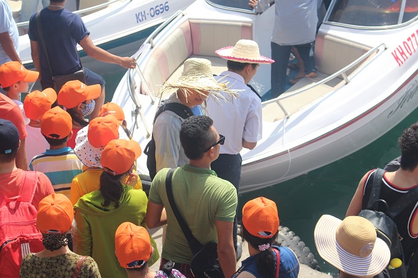 Lúc 9h25 ngày 4/7, tại bến tàu du lịch Cầu Đá (TP Nha Trang), khách Trung Quốc đến đây đi tàu du lịch rất nhộn nhịp. Một người đàn ông Trung Quốc trạc 38 tuổi, đeo ba lô, đội mũ lá… ra hiệu đoàn khách lên tàu. Khi một nhóm khoảng 10 người Trung Quốc lên một ca nô thì một số “cò” bảo nán đợi cho “hướng dẫn viên” (tức người đàn ông Trung Quốc kia). Anh ta lên canô rồi đứng ở đầu mũi ra hiệu chỉ trỏ, nói tiếng Trung Quốc như một HDV du lịch cho đoàn khách. Khi chúng tôi tiếp cận hỏi bằng tiếng Việt thì anh ta ú ớ không trả lời được.
