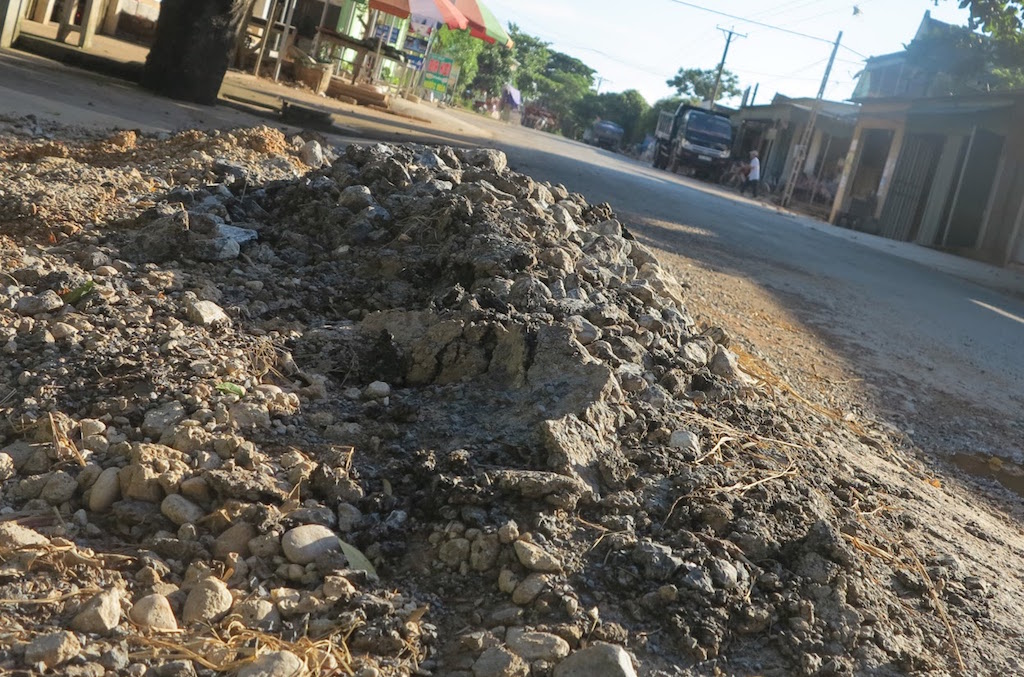 Những chiếc xe này đủ các kích cỡ khác nhau, trong đó cát, sỏi có trọng lượng rất lớn nhưng những chiếc xe này vẫn ầm ầm lưu thông. Việc chỉ được thiết kế với trọng tải 7 tấn nhưng phải oằn mình gánh những chiếc xe tải trọng lớn dường như quá sức chịu đựng của con đường.