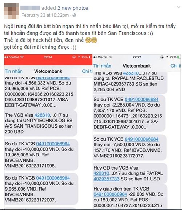 Trên trang cá nhân, nickname D.A chia sẻ câu chuyện của mình: "Đang ngồi rung đùi ăn bát bún ngan thì tin nhắn báo liên tục, mở ra kiểm tra thấy tài khoản đang được ai đó thanh toán tít bên Sanfranciscous. Thế là đã bị hack hết tiền, đen nhỉ. Gọi tổng đài mãi chẳng được".