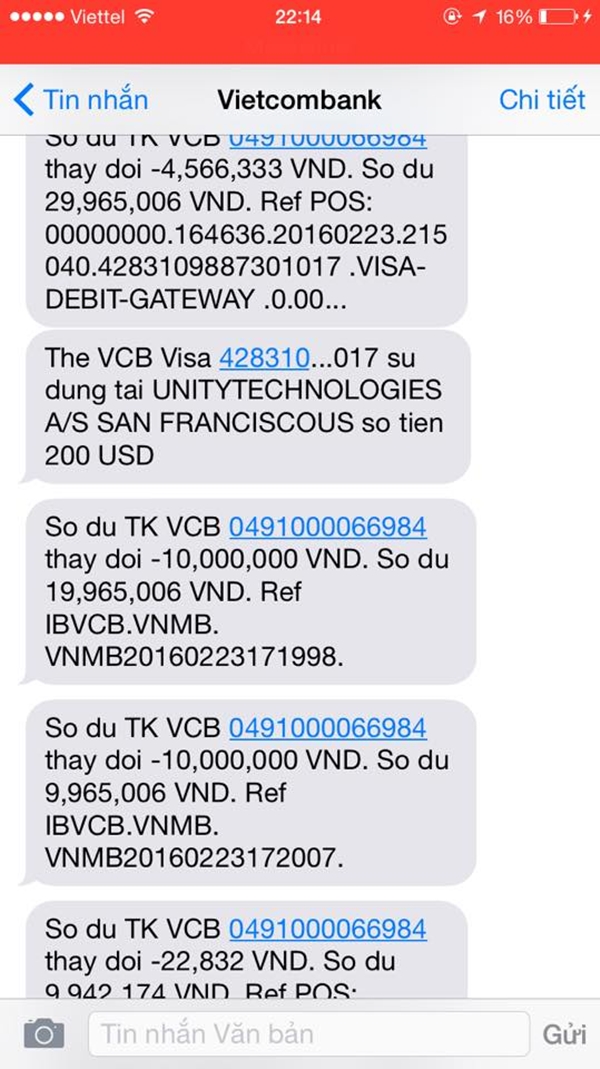 Trao đổi với chúng tôi, chị Đ.M.A (hiện đang sống và làm việc tại Hà Nội), nạn nhân trực tiếp trong vụ việc trên cho biết, chị đang sử dụng thẻ Vietcombank visa debit, trong tài khoản có khoảng hơn 2.000USD. Tối ngày 23/2, khi đang đi ăn tối, chị A. phát hiện điện thoại dồn dập báo về hàng loạt tin nhắn rút tiền ra khỏi tài khoản.