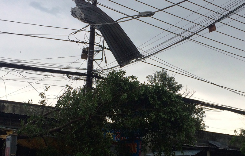 Theo ghi nhận của PV, trên đường Hoàng Hữu Nam (phường Tân Phú), nhiều tấm tôn gặp gió mạnh đã tốc mái, gió cuốn dính trên cột điện, đường dây điện.