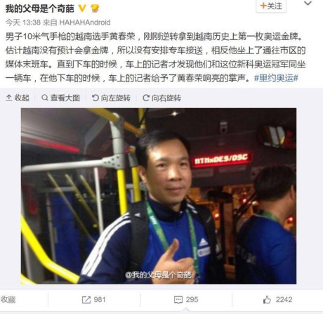 Hôm qua, trên trang xã hội của Trung Quốc đã đăng tải hình ảnh và thông tin xạ thủ Hoàng Xuân Vinh sau khi giành HCV và lập kỷ lục Olympic, tạo nên lịch sử cho TTVN nhưng không có xe đưa đón và lặng lẽ về trung tâm thành phố bằng chuyến xe cuối cùng của truyền thông.